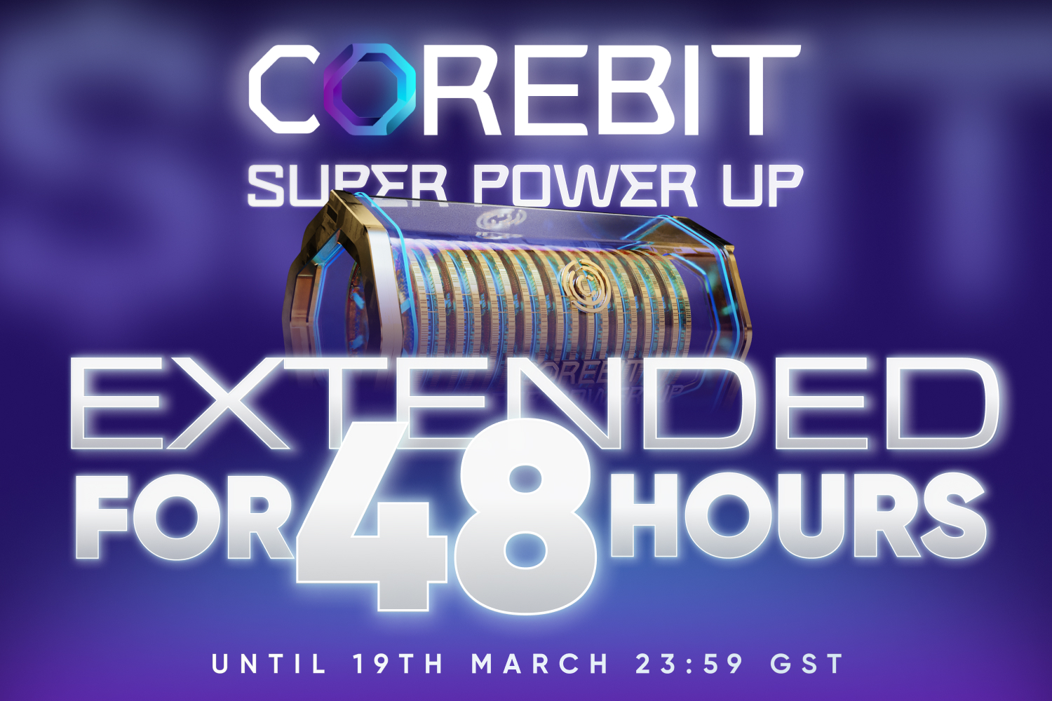 Corebit Super Power Up má celou komunitu v plamenech, a proto jsme se rozhodli dát vám jedno poslední rozšíření, abychom zajistili, že každý dostane tolik, kolik chce! Balíček bude k dispozici dalších 48 hodin, a to do středy 19. března do 23:59 GST. Více času na to, aby se každý dostal k 15 000 Corebitům nad rámec 200 BP; 550 bodů hodnosti; a 5 bodů aktivity, než se sníží množství Corebitu v balení. Toto jsou poslední hodiny, kdy C1 nabízí tolik Corebitu v balíčcích Corebit Super Power Up!