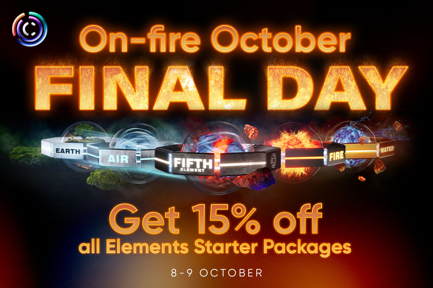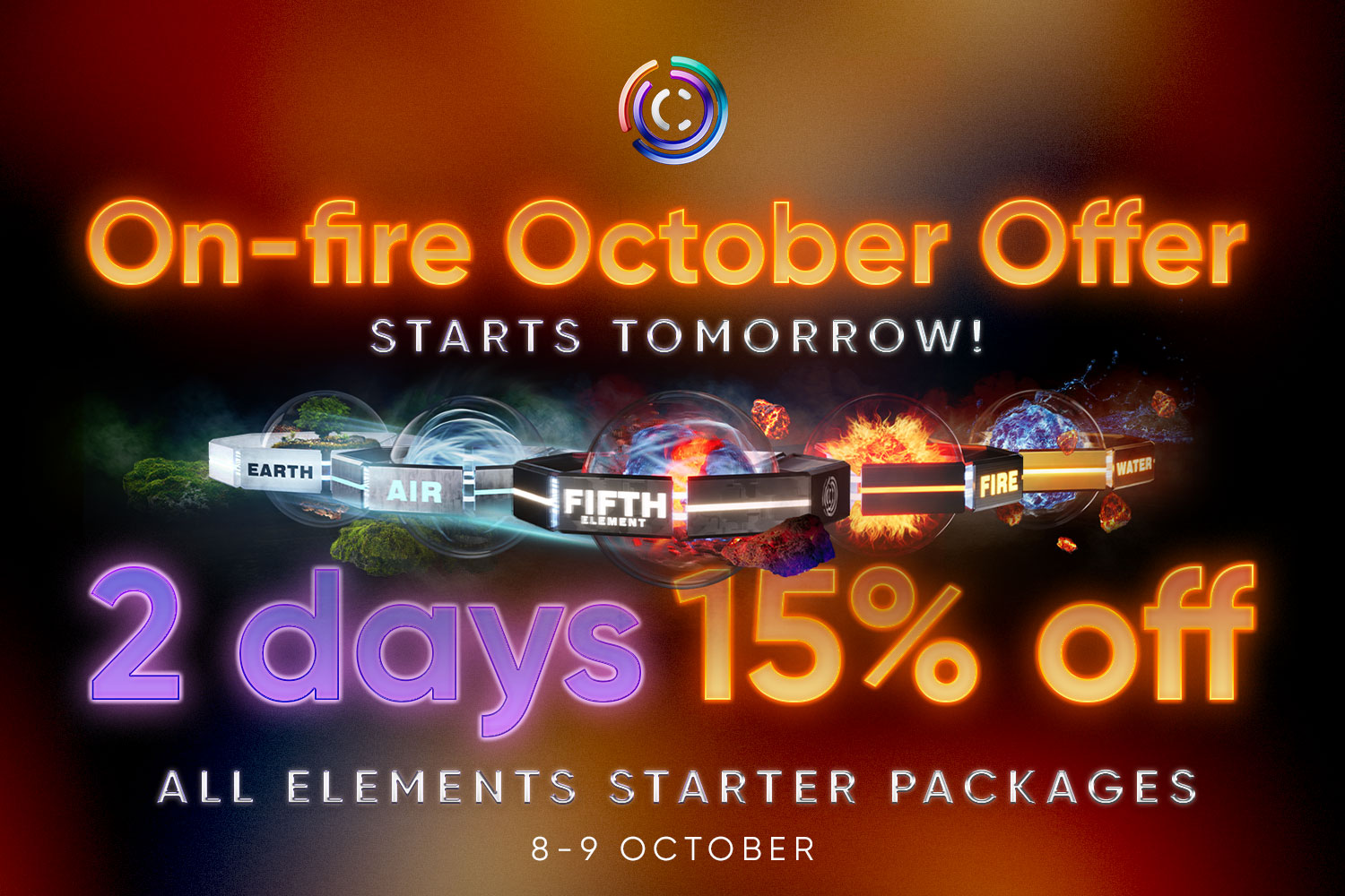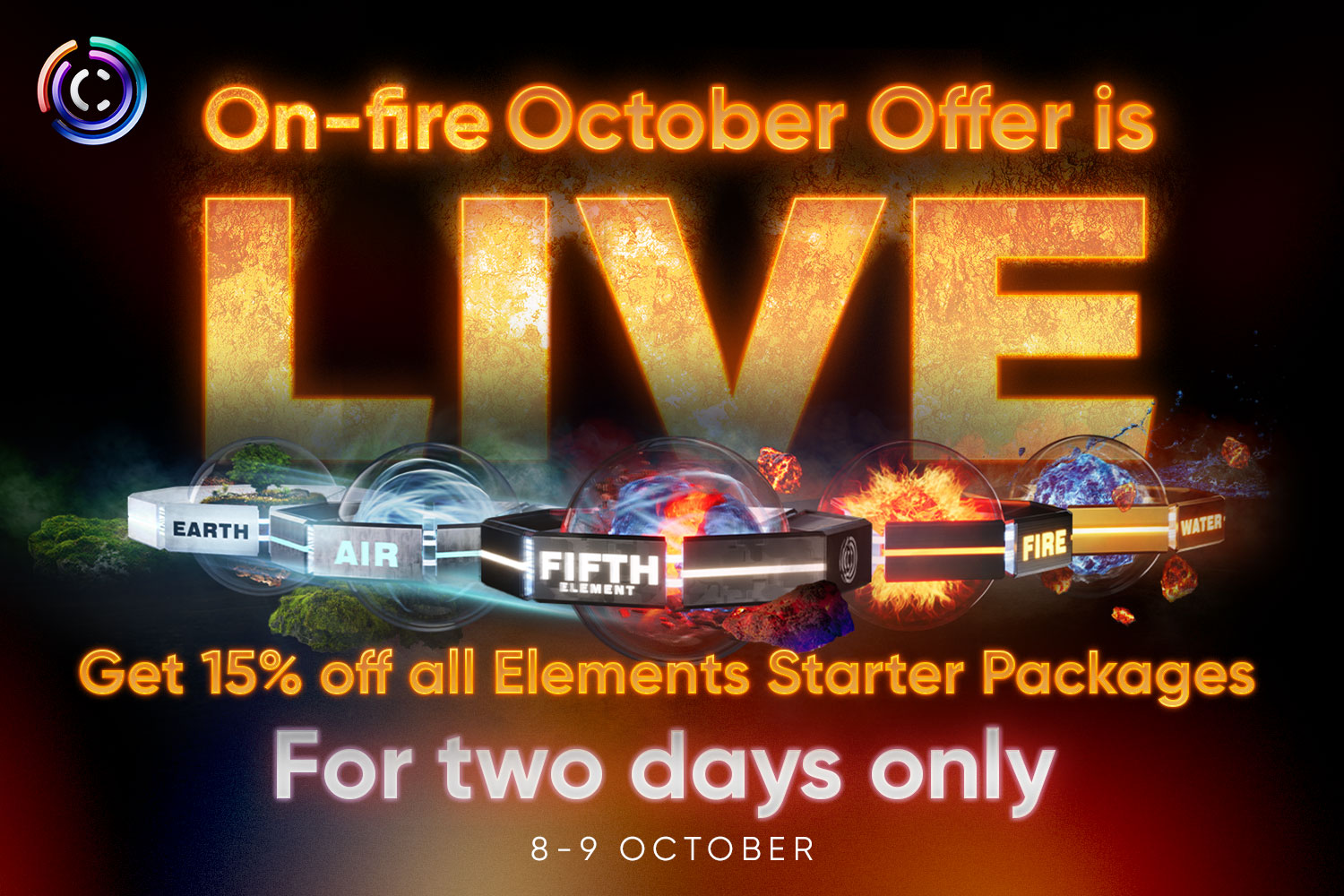 Dnes je ten den! Toto je 1. den žhavé nové promo akce C1: Říjnová nabídka On-fire! Získejte úžasnou 15% slevu na všechny startovací balíčky Elements pouze na dva dny. 8. a 9. října. Rozsviťte své podnikání na Web3!