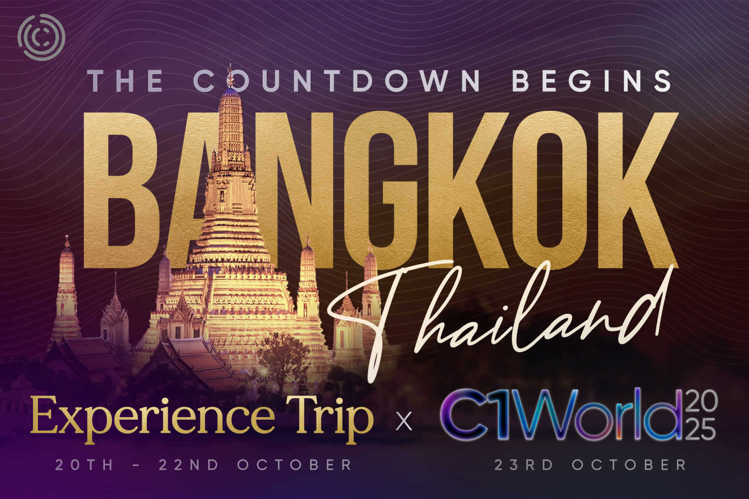 Za pouhých 6 dní se v Bangkoku sejdou vrcholní lídři C1 z celého světa, aby prožili několik nezapomenutelných dní vysoce energetického spojení a energie. Zážitkový výlet a konference C1 World 2025 se blíží! Vše začíná v pondělí 20. října třemi dny luxusního poznávání, networkingu a kulturního ponoření pro naše špičkové lídry, kteří se kvalifikovali na Experience Trip.