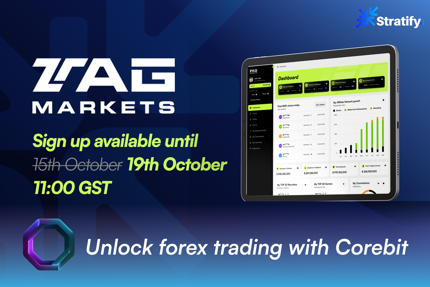 Neuvěřitelné partnerství s Tag Markets vytvořilo další výkonný nástroj Corebit. Tag Markets, poháněný společností Stratify, umožňuje vaše první kroky v obchodování na forexu díky speciální nabídce výhod, když spálíte své Corebit token. Získejte 5 osobních AP od 20. října do 30. listopadu, když se zaregistrujete a ověříte a zajistíte si odměny v RP pro své horní linie. Vzhledem k obrovskému zájmu byl termín registrace na platformě prodloužen a je nyní k dispozici do neděle 19. října 11:00 GST. Vše, co musíte udělat, abyste naskočili na palubu této bezprecedentní příležitosti, je dát si Corebit! Využijte naše probíhající promo akce, nahrajte si Corebit a pak vylepšete svou cestu obchodováním na forexu na Tag Markets s iniciativou Corebit Burn!