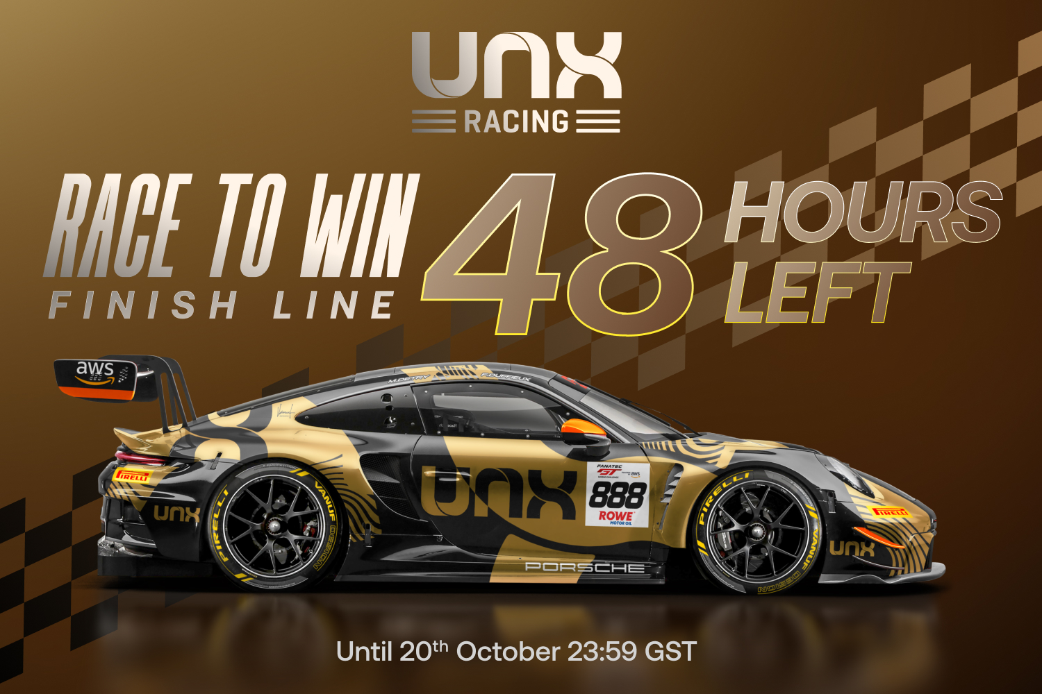 Jsme v závěrečné části epické promo akce Race to Win! Pokud pokukujete po prvním místě a neuvěřitelně hodnotné ceně, nyní je čas šlápnout na plyn. Do pondělí 20. října 2025 23:59 GST se každý kvalifikační nákup a prodej bude započítávat do vaší pozice v žebříčku UNX Racing. Všichni se těší na exkluzivní VIP balíček odměn, který zahrnuje oficiálně podepsané zboží UNX Racing, VIP zážitek ze závodního víkendu v Sepangu v Malajsii od 10. do 12. prosince a prestiž v podobě uvedení jejich jména na voze UNX Racing v asijské sérii Le Mans.