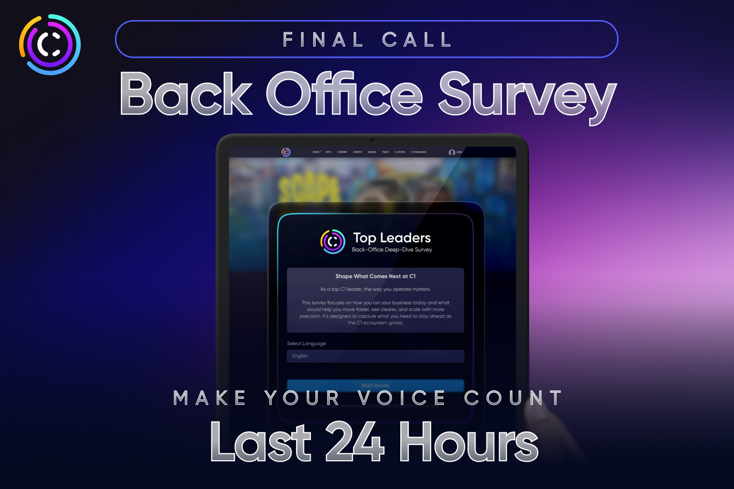 Průzkum Back Office dnes končí a toto je vaše poslední příležitost dát najevo svůj názor. Dokončení zabere jen pár minut, ale získané poznatky pomáhají formovat priority, zdokonalovat stávající platformy a usměrňovat budoucí produkty C1. Nezapomeňte průzkum sdílet se svým týmem a také se seznamovat kontakty. Silnější účast znamená jasnější signály a lepší rozhodnutí pro všechny.
