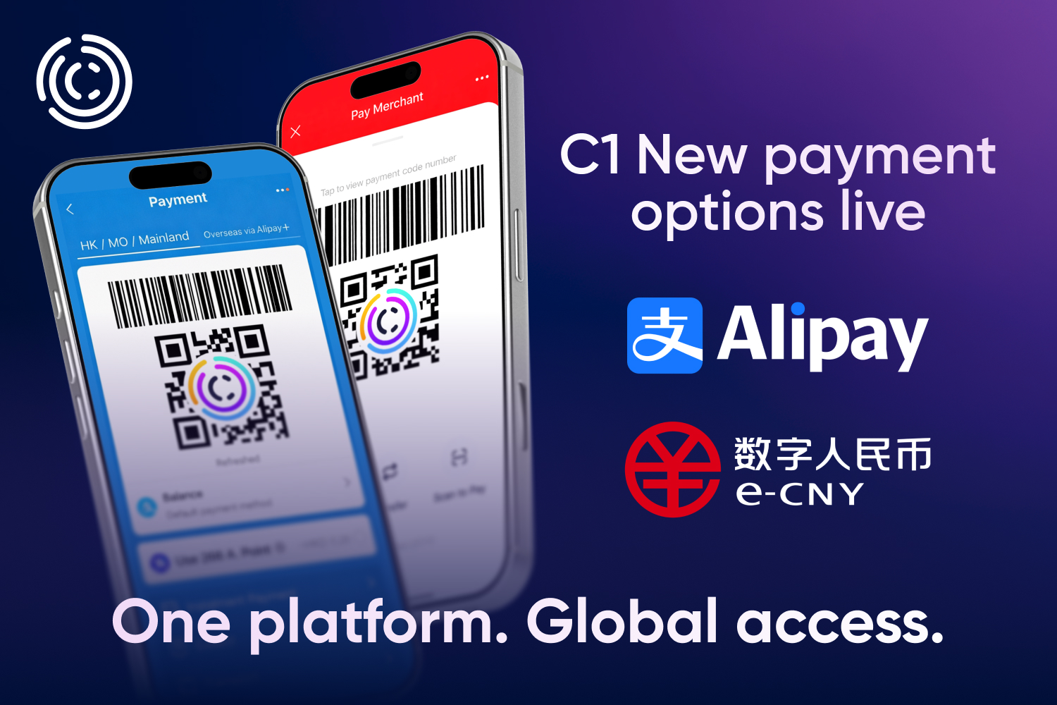 C1 se stále rozšiřuje a stejně tak rostou i vaše platební možnosti! Alipay a e-CNY jsou nyní dostupné jako platební metody ve vašem C1 Back Office. Integrací těchto široce přijímaných řešení fiat plateb učinil C1 účast hladší než kdy dříve. Zapojení do C1 je nyní jednodušší a plynulejší pro miliony uživatelů v měně a metodě, kterou už denně používají. Méně tření. Rychlejší onboarding. Širší dosah.