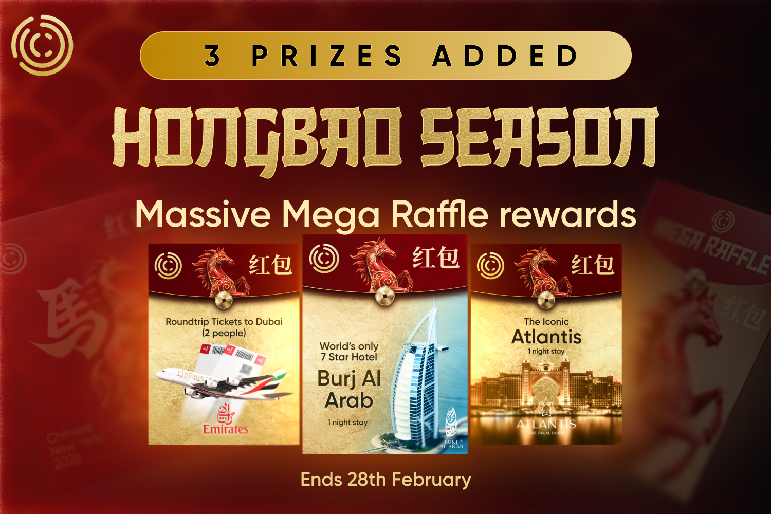 Tato hongbao sezóna je v plném proudu a uvolňuje bezprecedentní růst pro komunitu. A teď se největší výherní soutěž v historii C1 ještě zvětšila. Do prize poolu přidáváme tři mimořádné zážitky pro dva lidi: 1× exkluzivní ultra-luxusní noc v nejikoničtějším sedmihvězdičkovém hotelu Burj Al Arab, 1× elitní prémiovou noc v nejproslulejším ultra-luxusním resortu Atlantis The Royal v Palm Jumeirah, 1× zpáteční letenky u světově proslulých leteckých společností Emirates do Dubaje. To znamená, že další tři šťastní vítězové budou moci zažít Dubaj ve světové třídě. S více než 30 hlavními vítězi, kteří mají být vylosováni, je toto oficiálně nejvzrušující Mega Raffle, jaká kdy C1 byla zahájena. Pamatujte: neexistuje žádný limit, kolik Hongbao můžete získat, ani omezení, kolik vstupů do tomboly můžete získat. Tato sezóna v Hongbao je především o vytváření maximálního tempa, protože každá otevřená obálka je výherní a každý Mega Tomfle tiket šancí na ještě větší cenu.